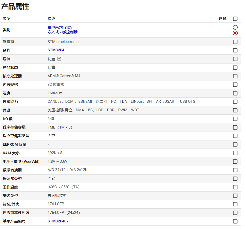 詳細描述: ARM® Cortex®-M4 series 微控制器 IC 32 位單核 168MHz 1MB(1M x 8) 閃存 176-LQFP(24x24)